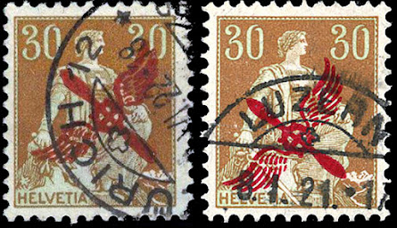 In the left stamp there is a very small white dot between the letters ‘R’ and ‘A’ of ‘FRANC’. The right hand side stamp has a broken line and white space below the
