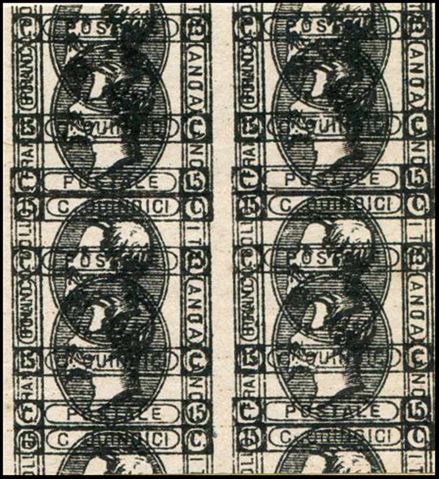 General Characteristics: Flaw in top left limb of T in POSTALE; dot in margin level with O in FRANCO; small dot on top of D in QUINDICI; small dot in top margin left of P.